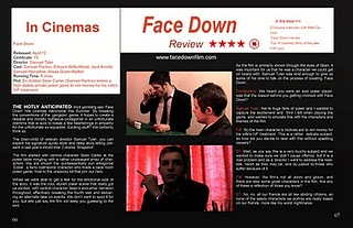 The pictures of our central characters in the magazine film review displays there characters, with the archetypal villain Eddie staring menacingly down the camera, unsettling the viewer whilst the nervous Sean is shown in desperation looking away from the camera drinking alcohol to calm his nerves. Clearly you can see the difference the character profiles make at the centre of our review opposed to the poster in earlier designs. In addition the mock interview, influenced by 'Empire' gives the director's perspective - informing the viewer of his intention, and humanising the characters.